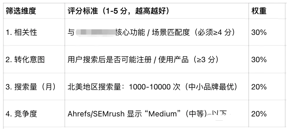 從挖掘到的幾百個字中,用以下4個維度篩選,最終保留2-3個核心關鍵字;10個以內一級核心詞,以及不限個長尾核心詞。 (再次提醒,要那種貼合產品、使用者、場景、市場的,且流量相對大一些,競爭度盡量中小的)。