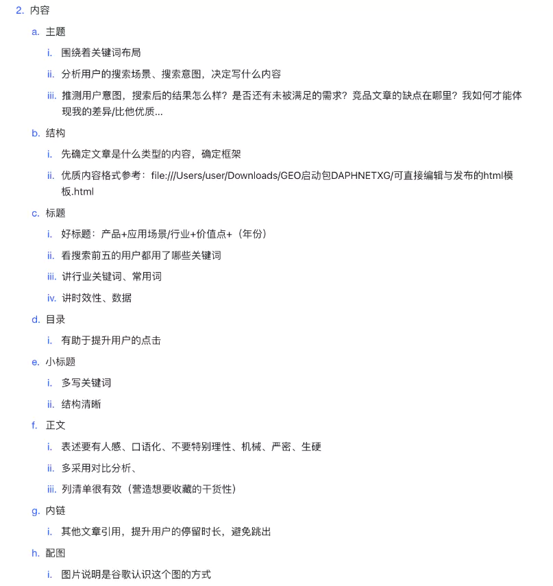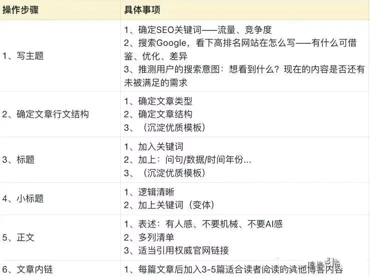 一篇內容,可以分割成主題、結構、標題、目錄、內文、內鏈、配圖幾個部分。每個部分都有一些小技巧,我截圖放在下面了,大家在寫的時候可以對照。