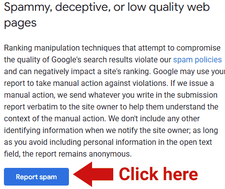 「Google可能會使用您的舉報資訊對違規行為採取人工處理措施。如果我們採取人工處理措施,我們會將您在舉報信息中填寫的內容原封不動地發送給網站所有者,以幫助他們了解處理措施的背景。我們在通知網站所有者時不會包含任何其他身份識別信息;只要您避免在開放式文本字段中包含個人信息,」舉報信息就會保持匿名。」舉報信息就會保持匿名。
